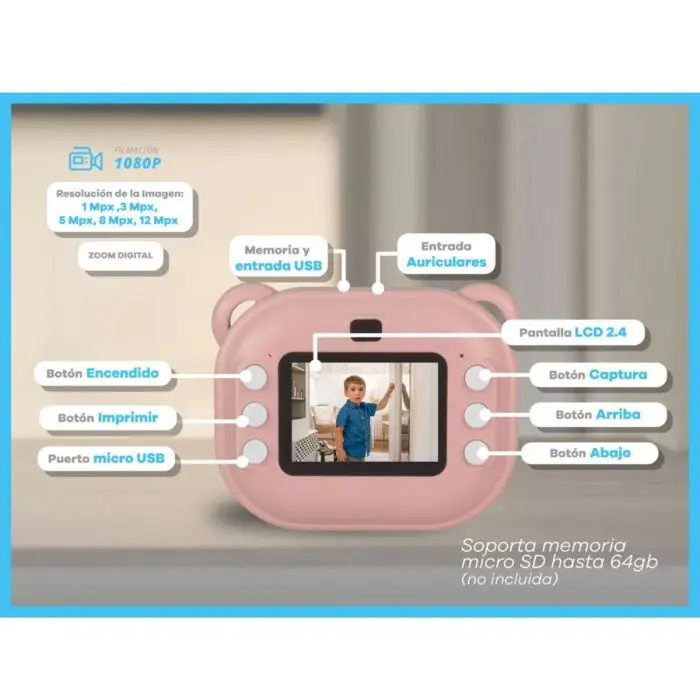 Diseñada especialmente para pequeños exploradores, esta cámara permite tomar fotos y videos en alta definición y imprimir instantáneamente sin necesidad de tinta. Además, incluye filtros, marcos, juegos y muchas funciones que estimulan la imaginación.